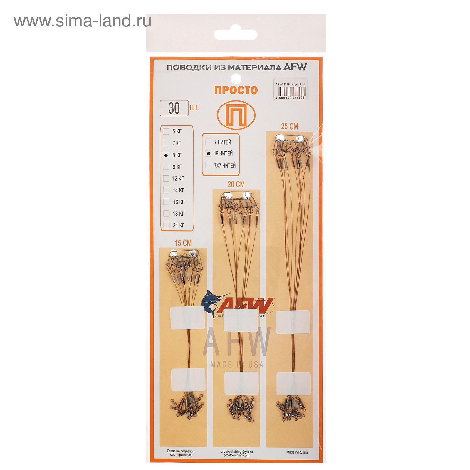 Набор поводков AFW 1x19 нитей 30 штук в упак. 0,25мм - 8 кг 15-20-25 см по 10 штук